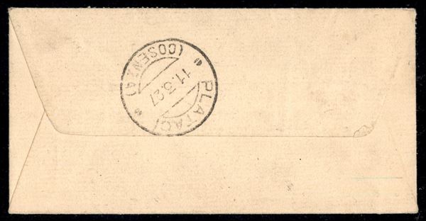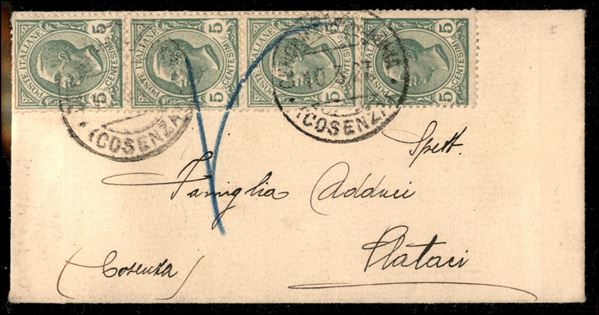 Striscia di quattro del 5 cent Leoni (81r) con ovale mancante (ben visibile sui primi due esemplari) - bustina da Cerchiara di Calabria a Plataci del 10.3.27