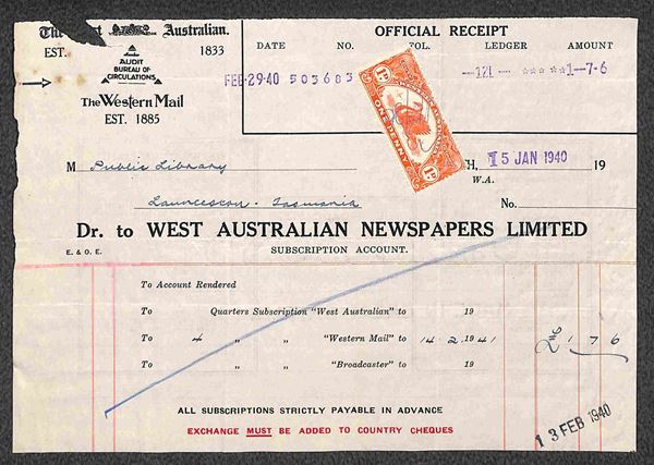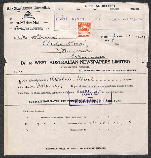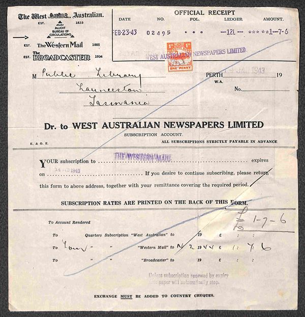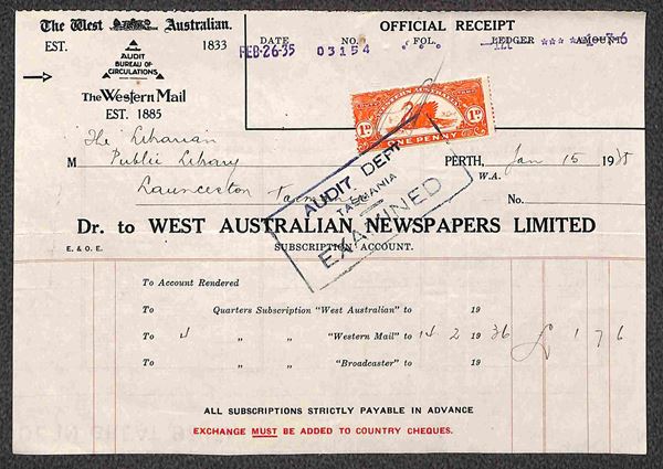 Tasmania - 1935/1943 - Quattro ricevute da Perth per Lanceston
