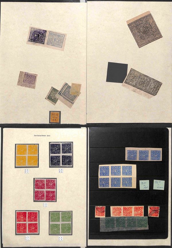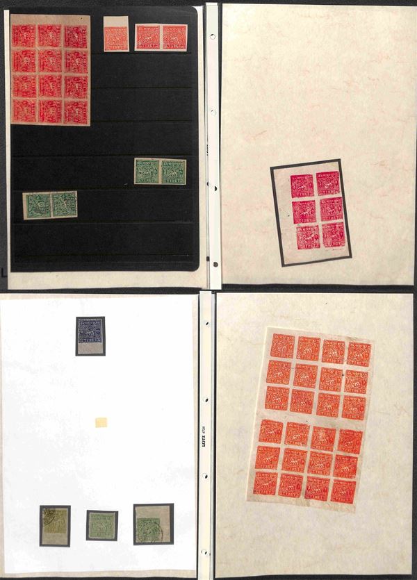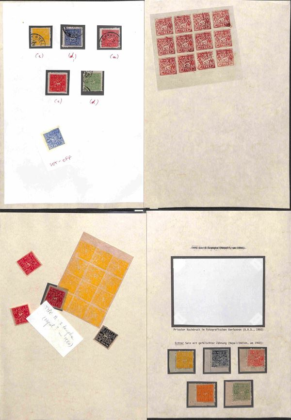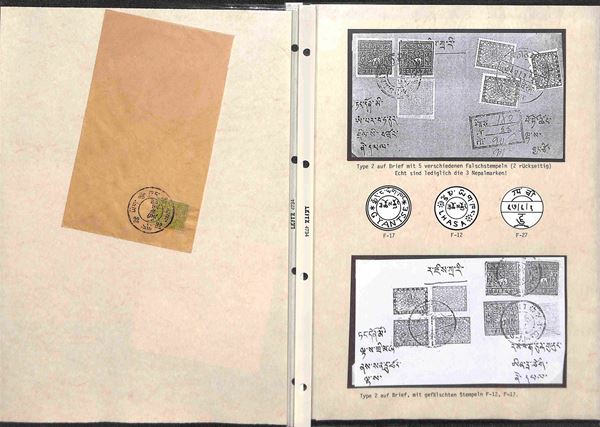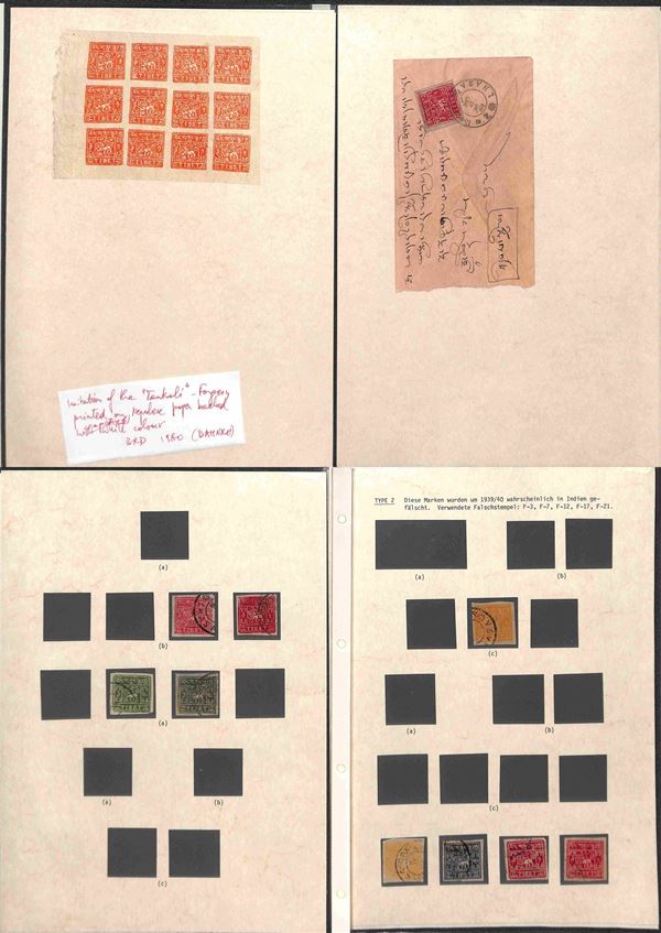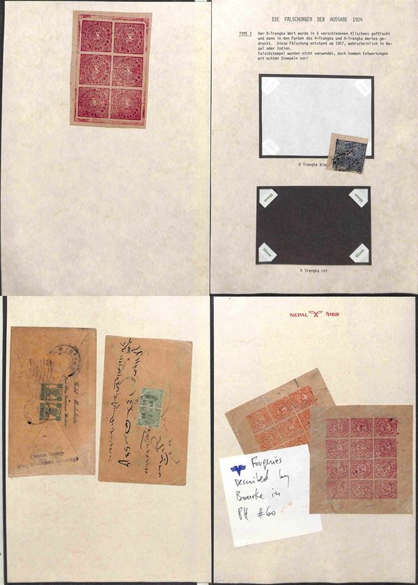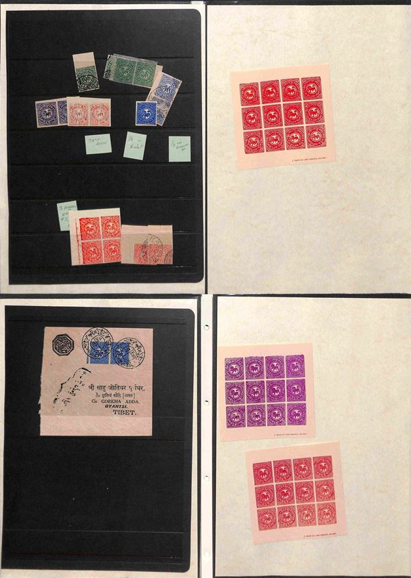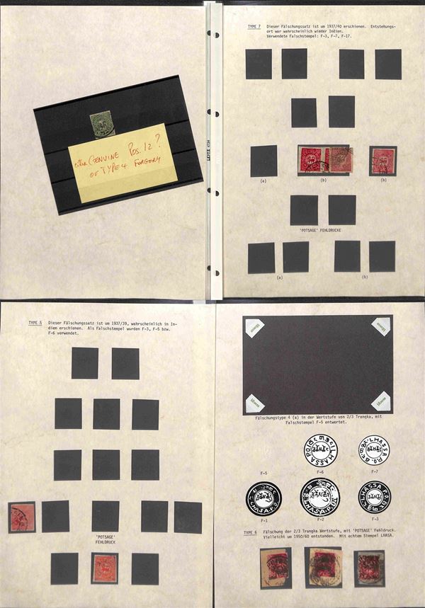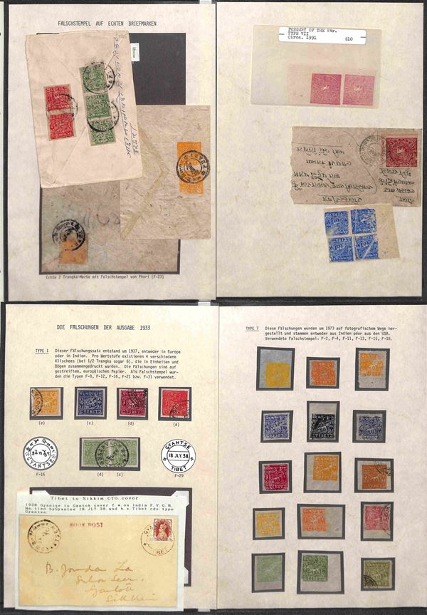 TIBET - Collezione specializzata dei Falsi delle emissioni montata su 33 fogli d'album - 126 valori (singoli/coppie/blocchi) nuovi e usati + 11 lettere con diverse affrancature - insieme molto interessante per collezionista avanzato - ex Coll. Hellrigl