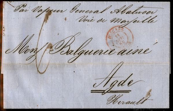 Toscane Bastia (rosso) 11.11.58 - lettera da Livorno a Agde via Bastia + Marsiglia/Lyone - tassata