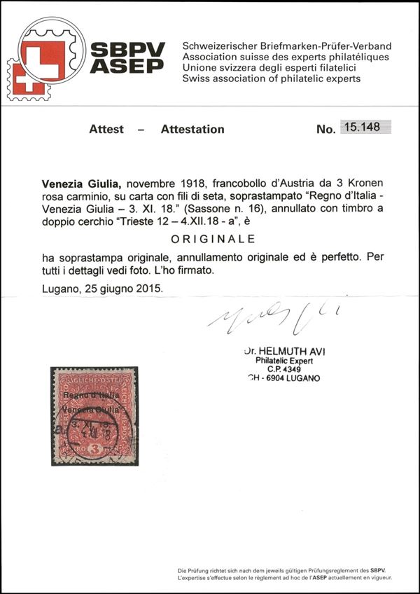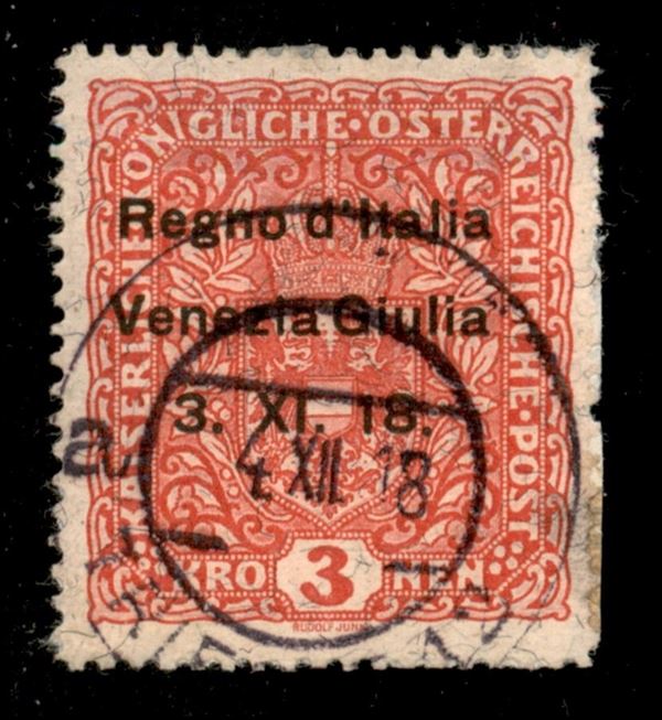 Venezia Giulia - francobollo di Austria soprastampato K.3 (16) usato con annullo di Trieste