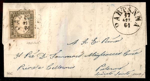 10 cent grigio oliva chiaro (14C - Sardegna) isolato su bustina da Partanna a Palermo del 17.10.1861 - molto bella - G. Bolaffi + A. Bolaffi