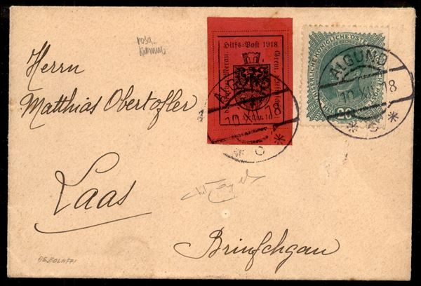 10 heller (5) in affrancatura mista con 20 heller Austria (222) - busta da Algund a Laas del 10.12.18 - cert Raybaudi