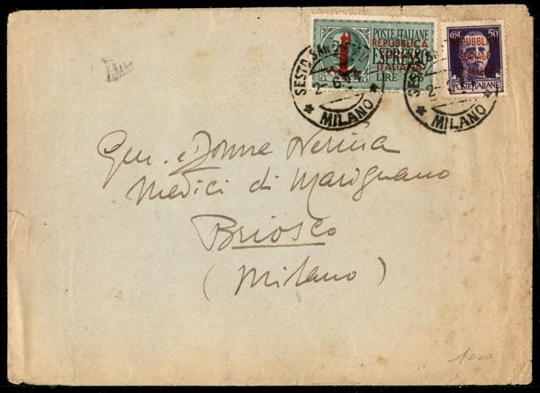 1,25 lire (21 - Espressi) + 50 cent (493) - busta da Sesto S. Giovanni a Briosco del 2.6.44