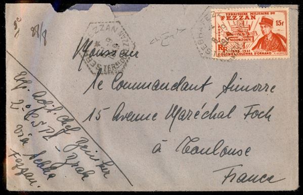 15 franchi (23) isolato su busta da Sebha a Tolone del 8.9.49 - non comune - Raybaudi