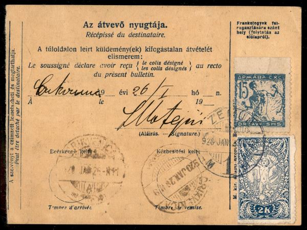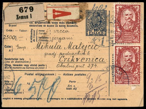 15 vin (102) non dentellato in alto + 2 kr (110) - bollettino da Zemun a Crikvenica del 23.1.1920 con affrancatura multipla fronte retro