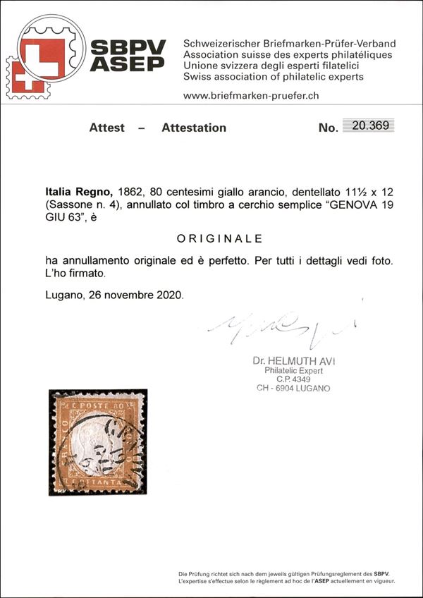 1862 - 80 cent (4) usato - molto bello - cert. Avi