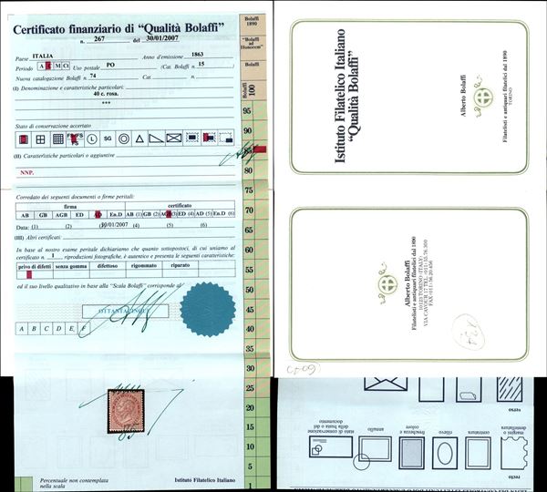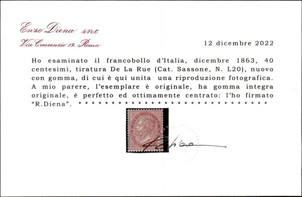 1863 - 40 cent tiratura di Londra (L20) - gomma integra - ottimamente centrato - cert. R. Diena + cert. finanziario Bolaffi 85%