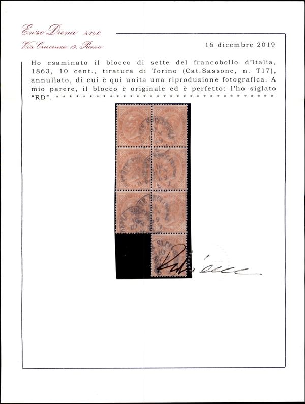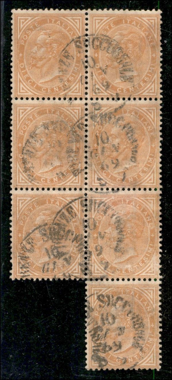 1863 - Blocco di sette del 10 cent (T17) annullato "Partenza Succursale" del 10.1.69 - cert. Diena