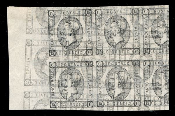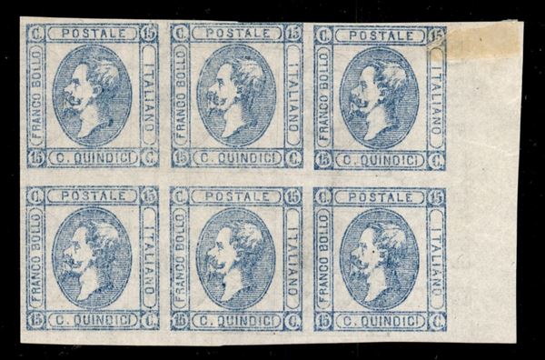 1863 - Prova di Stampa - 15 cent Litografico (12 - celeste chiaro) - blocco di 6 bordo foglio con controstampe in grigio (diritta e speculare) al retro - sempre senza gomma