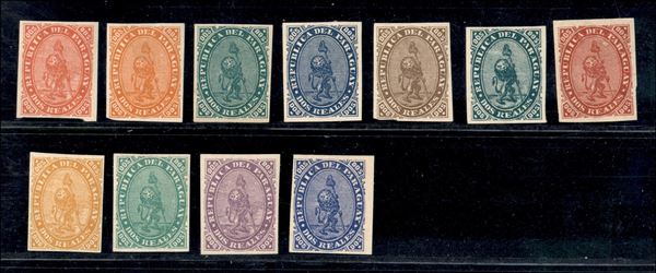 1881 - 11 prove di colore su carta sottile del 2 real - senza gomma