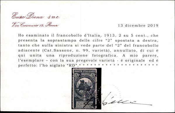 1913 - 2 lire su 5 cent (99ec) con soprastampa spostata a destra e cifre a cavallo - usato (leggerissima abrasione sul lato destro) - cert. Diena