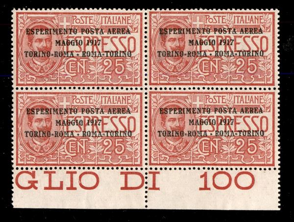 1917 - Torino Roma Torino - 25 cent (1) in quartina bordo foglio - ottimamente centrata - gomma integra