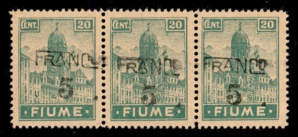 1919 - Franco 5 su 20 cent (A 75 cba) - striscia di tre con soprastampe oblique - gomma integra (1350)