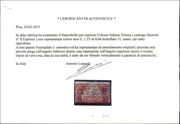 1935 - 1,25 lire su 60 cent (8 - Espressi) dentellato 11 - usato - cert. AG (1.600)