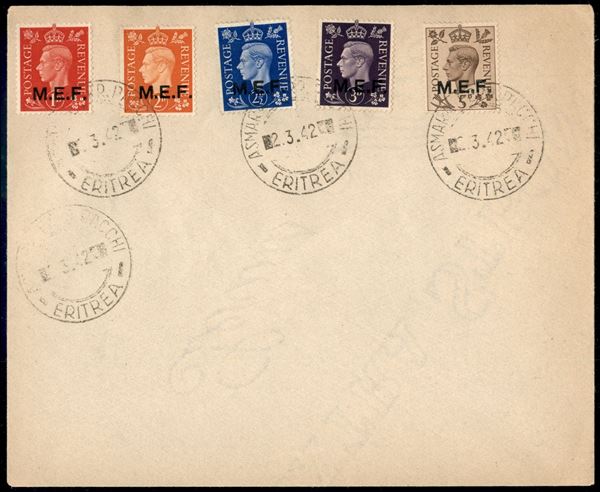 1942 - Cairo (1/5) - serie completa su busta nel giorno d'emissione - raro insieme - Asmara 2.3.42 - cert. AG