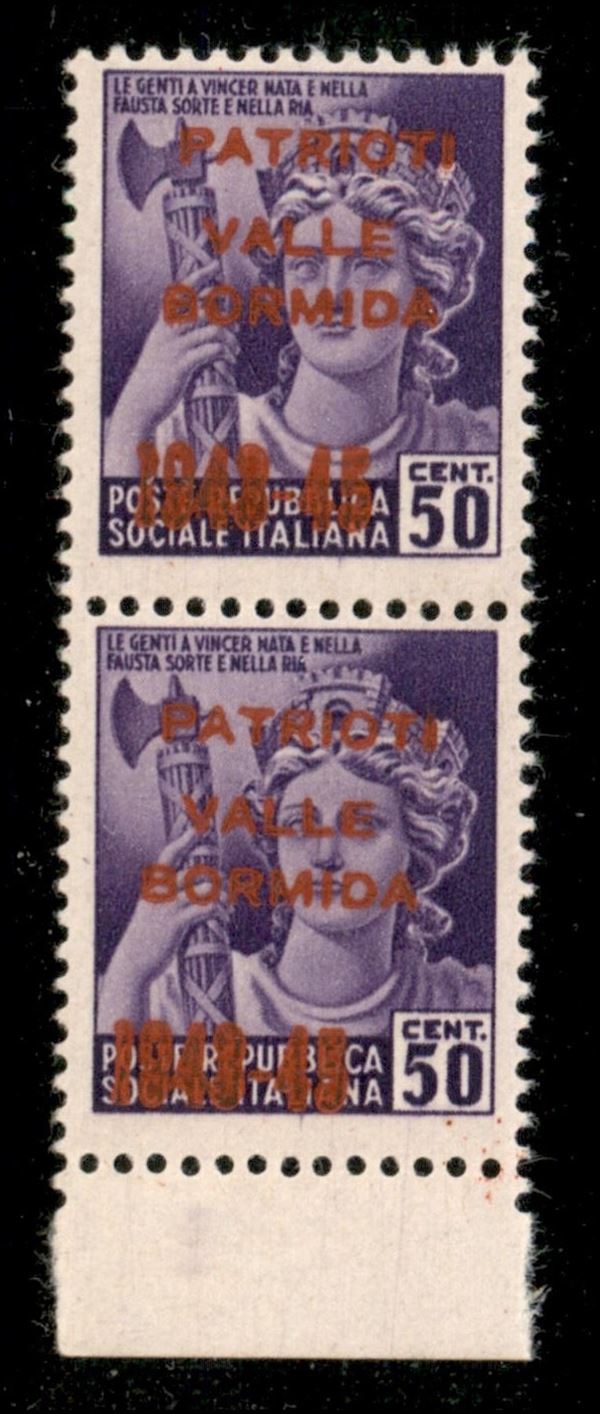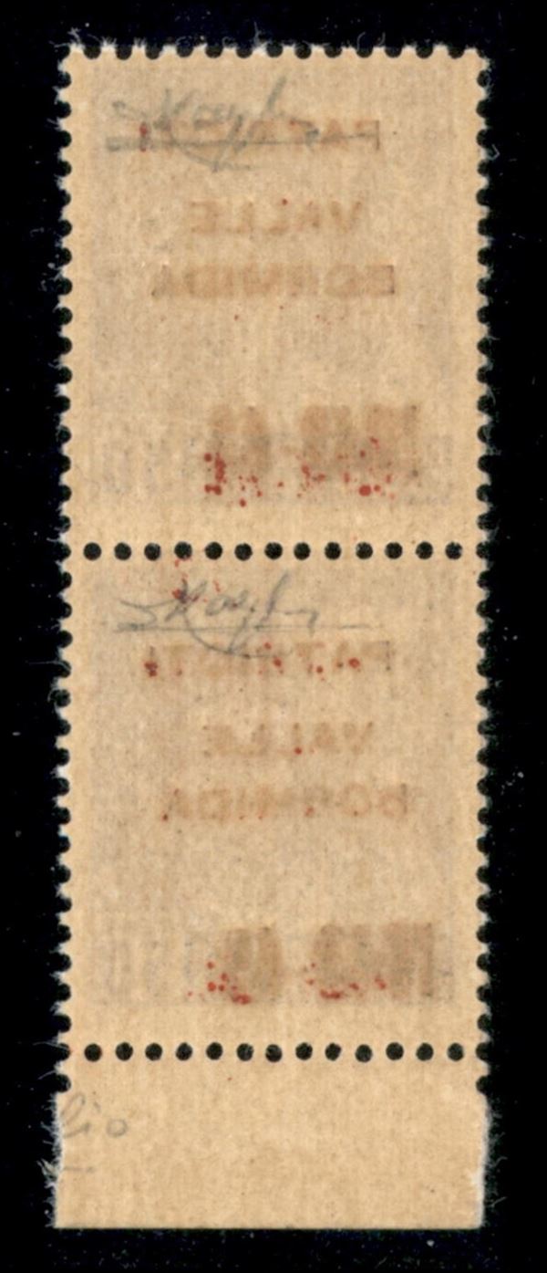 1945 - Soprastampa Vermiglio - 50 cent (5A) in coppia verticale bordo foglio con soprastampa del pezzo inferiore spostata (in basso a sinistra) - gomma integra - non catalogata - Raybaudi