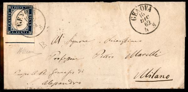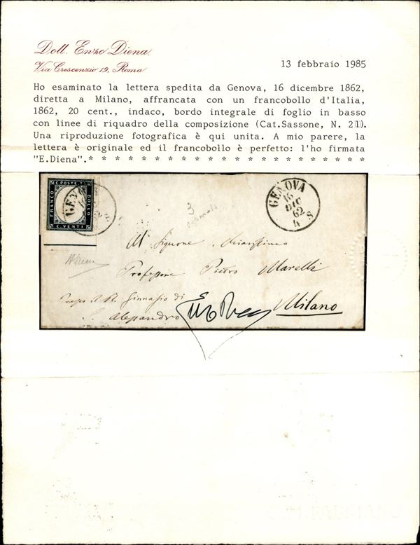 20 cent (2l) non dentellato in basso con bordo integrale - lettera da Genova a Milano del 16.12.62 - cert Diena (12.000)
