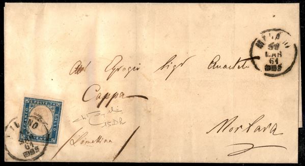 20 cent cobalto chiaro (15Dh) - lettera da Milano a Mortara del 30.30.61 - cert. Oro Raybaudi (21.000)