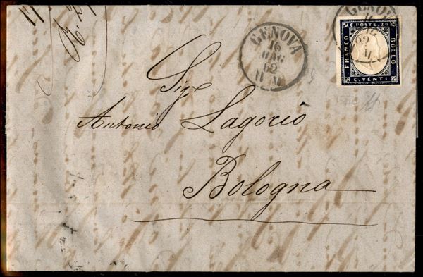 20 cent indaco violaceo scuro (15Ea) su lettera da Genova a Bologna del 16.5.62 - A. Diena