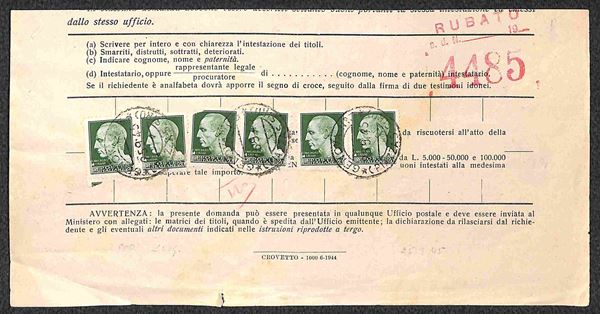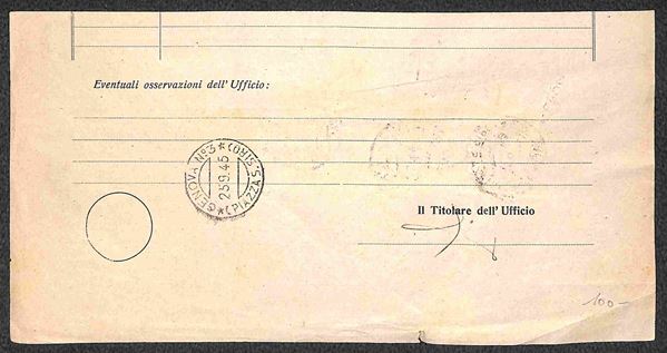 20 lire Imperiale (259) - uso amministrativo di 3 coppie su parte di modulo (Buoni Fruttiferi) da Genova del 25.9.45 - da esaminare