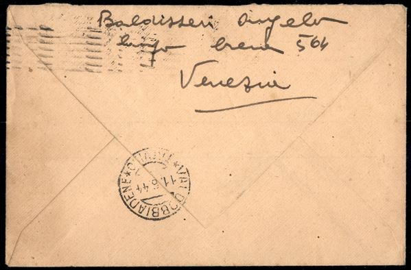 25 cent (491) + 25 cent (491phd) con soprastampa in alto + 1,25 lire (495) + espresso da Milano a Valdobbiadene del 8.6.1944