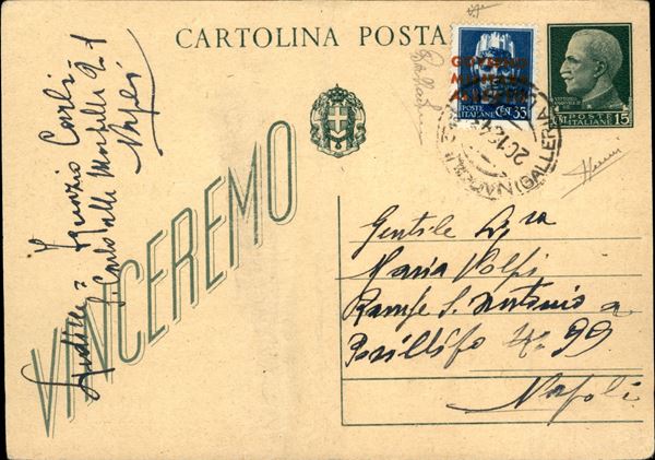 35 cent soprastampato (11) su intero postale da 15 cent (C97) per cittą - Napoli 20.12.43 - cert. Sorani