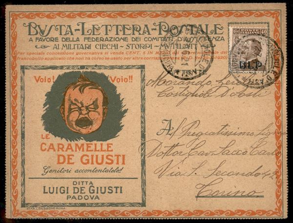 40 cent BLP (4A - azzurro nera) su busta speciale (11/20 II Nazionale - giallo) da Castiglione a Torino del 27.6.1921 senza foglio interno