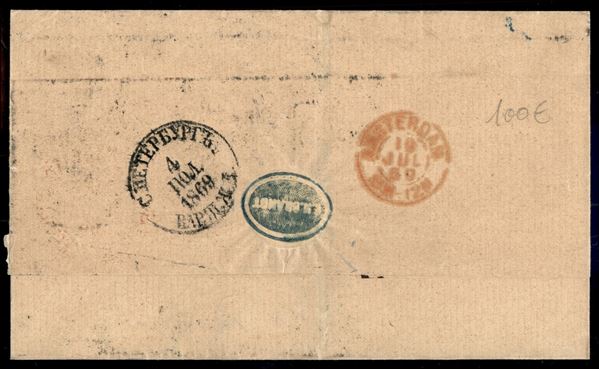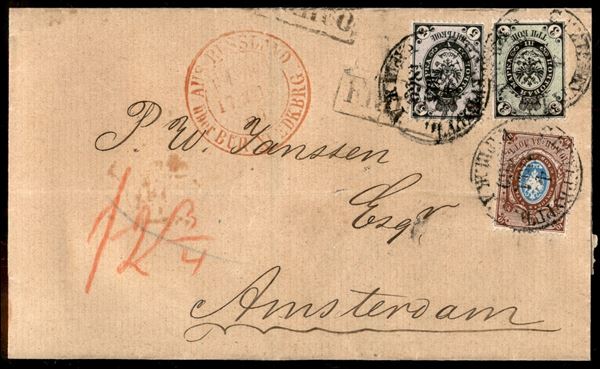 Affrancatura tricolore (19 + 20 + 21) su lettera per Amsterdam del 1869 - leggera piega sul 10 kopechi