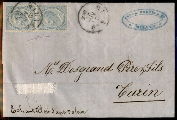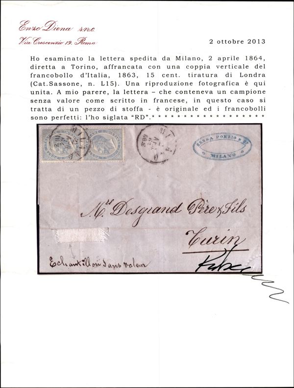 Campione Senza Valore - busta affrancata con coppia del 15 cent (L18) da Milano a Torino del 2.4.64 - cert. Diena