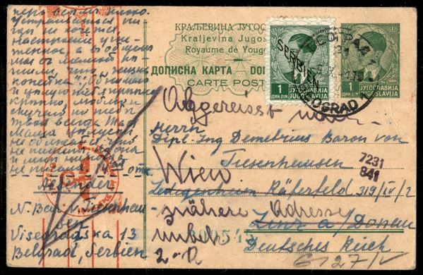 Cartolina postale da 1 din con gemello Serbien (395) da Belgrado a Lienz del 9.10.1941 inoltrato a Vienna