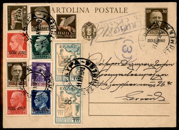 Cartolina postale da 30 cent (13) con affrancatura complementare multipla (1/8 + 1 Aerea) completata da valori Antitubercolari) da Corfù del 11.4.1942