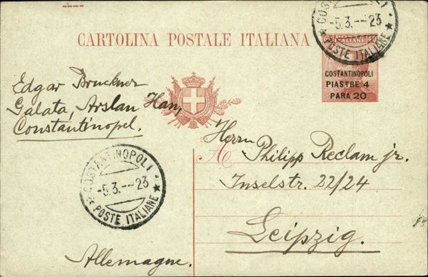 Cartoline postale da 4,20 piastre su 40 cent (C5-22) da Costantinopoli a Lipsia del 5.3.23 - taglio tipografico in alto a sinistra