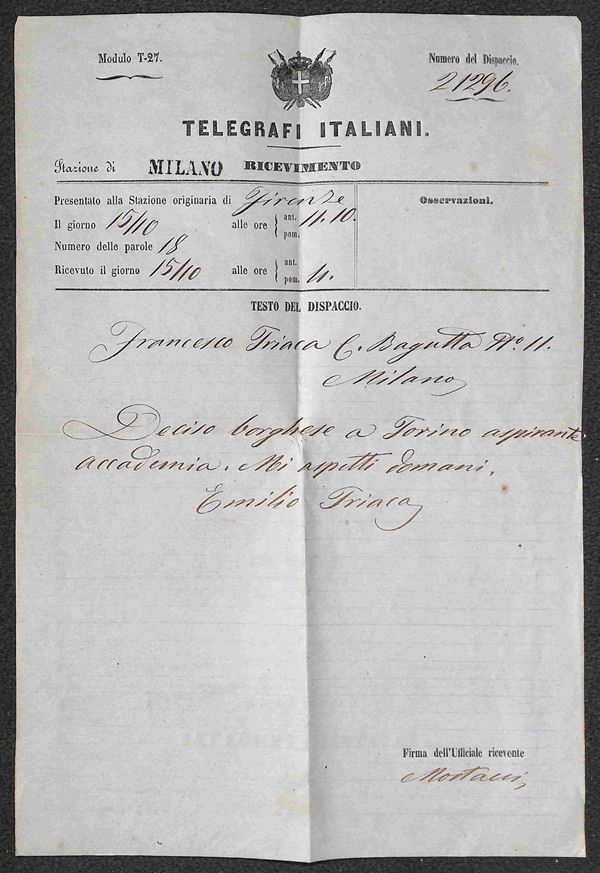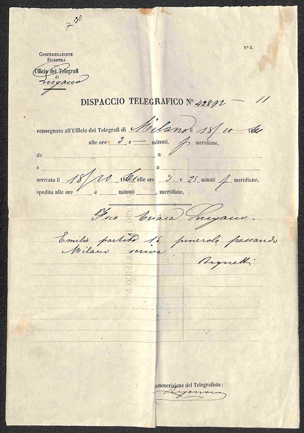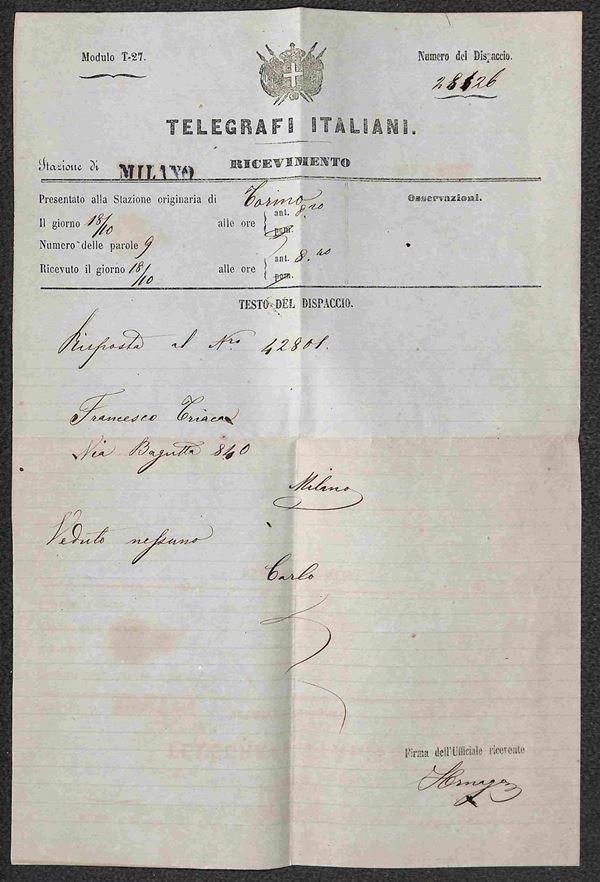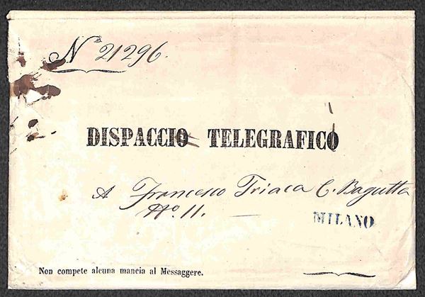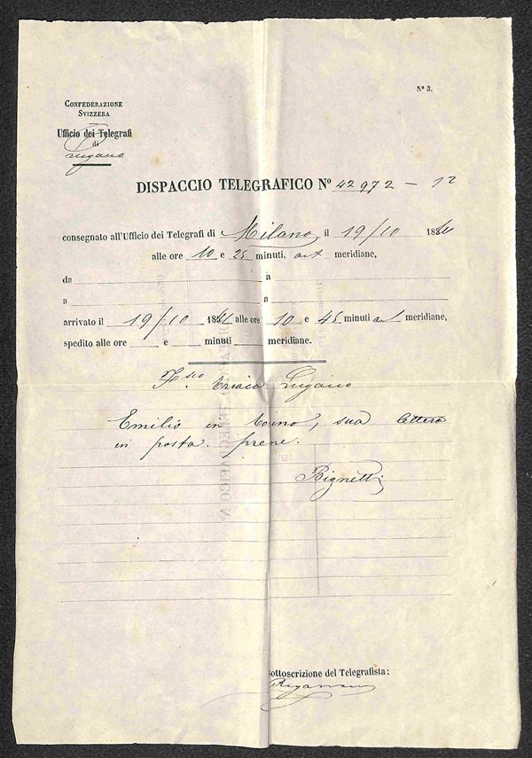 Dispacci Telegrafici - 1861 - Busta speciale con quattro dispacci in codice da Lugano Firenze (15 ottobre) Torino (18 ottobre) e Lugano (18 e 19 ottobre) per Milano + due ricevute per Firenze (9 e 13 ottobre) + nota appunti