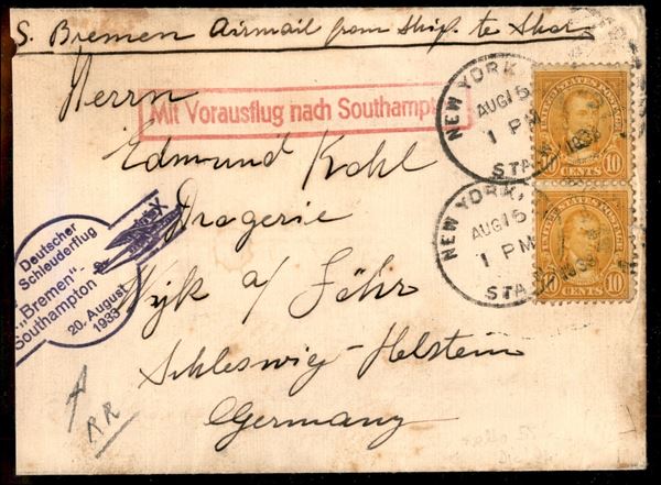 DOX - S. Bremen Southampton (Air mail 20.8.33) - coppia del 10 cent (272) su aerogramma da New York per la Germania del 15.8.33