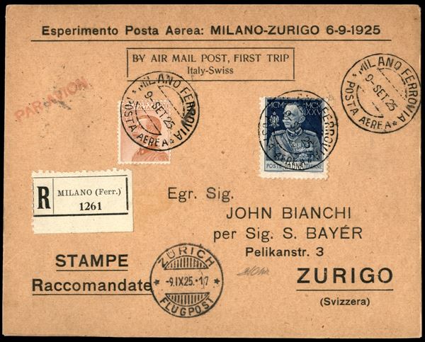 Esperimento Posta Aerea Milano Zurigo 9.9.25 - aerogramma raccomandato del primo volo (190 + 204)
