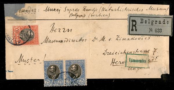 Etichetta di pacco raccomandato da Belgrado per l'Ungheria del 1.5.1910 (86 + 89 coppia)