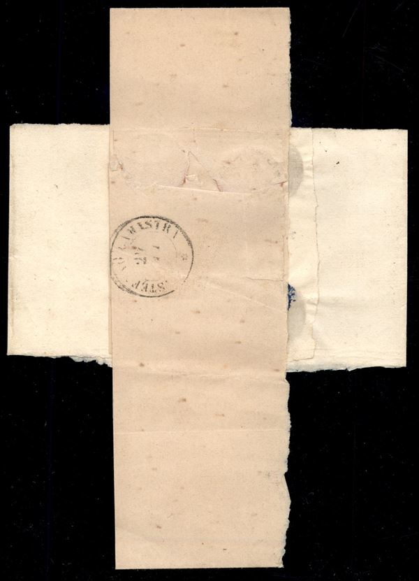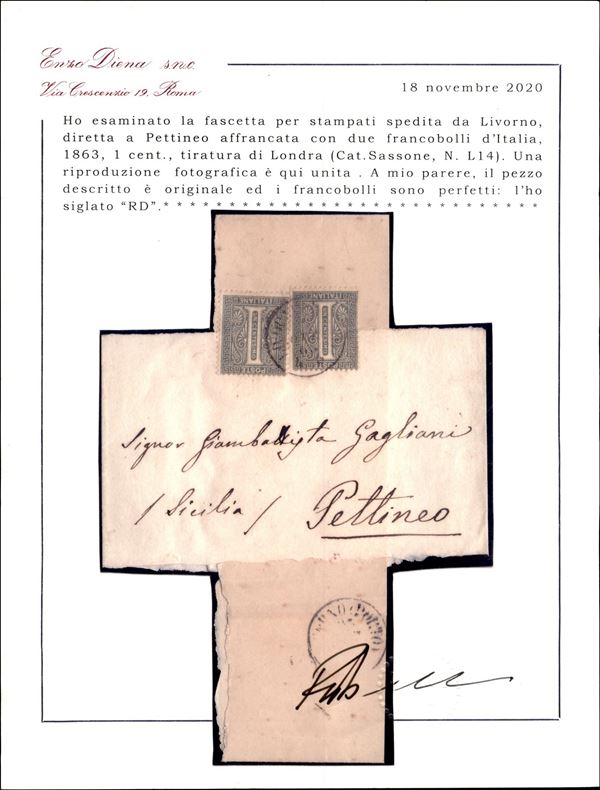 Fascetta a croce affrancata con due 1 cent (L14) da Livorno a Pettineo - cert. Diena
