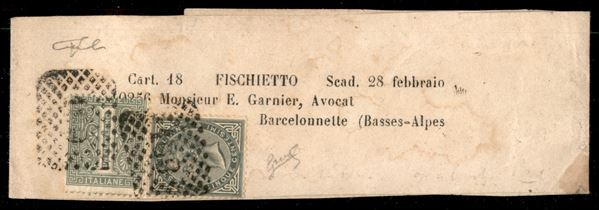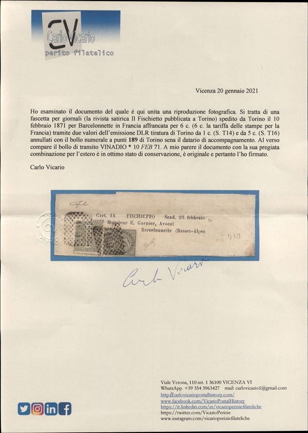 Fascetta per giornali (Il Fischetto) affrancata con un 1 cent (T14) + 5 cent (T16) da Torino a Barcelonnette del 10.2.71 - cert. Vicario