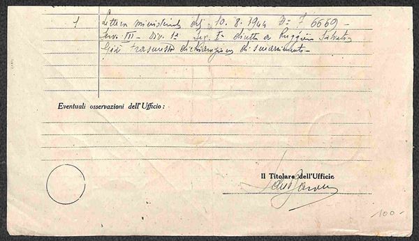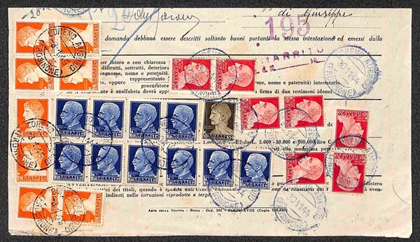 Imperiale (245+247 sette + 253 dieci +254 otto) - uso amministrativo in due tempi su parte di modulo (Buoni Fruttiferi) da Coreno del 30.11.44/3.1.45