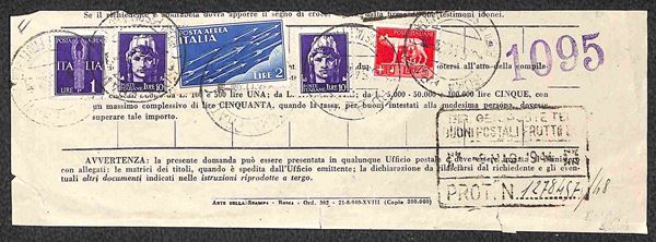 Imperiale (257+258 due + Aerea 14+15) - uso amministrativo su parte di modulo (Buoni Fruttiferi) da Roma del 8.5.44
