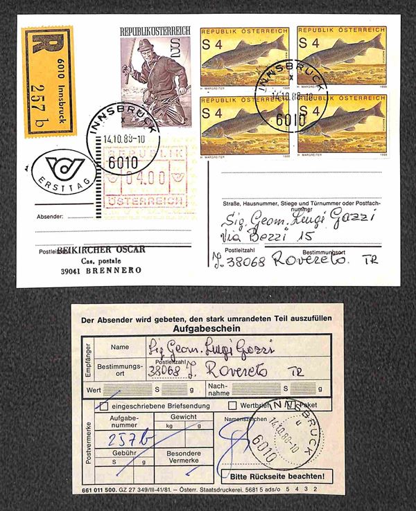 Intero postale da 4 scellini con tre ritagli gemelli + complementari raccomandato da Innsbruck a Rovereto del 14.10.88 (nel giorno d'emissione)