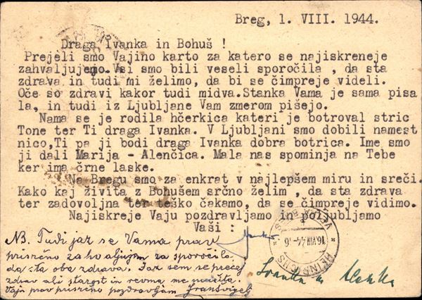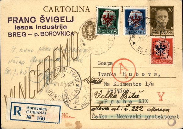 Intero postale raccomandato da 30 cent (C98) con affrancatura aggiuntiva per 1,70 lire (4+5+11) da Borovnica a Praga del 2.8.44