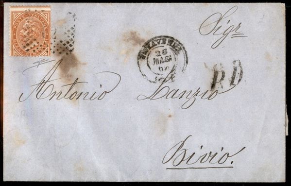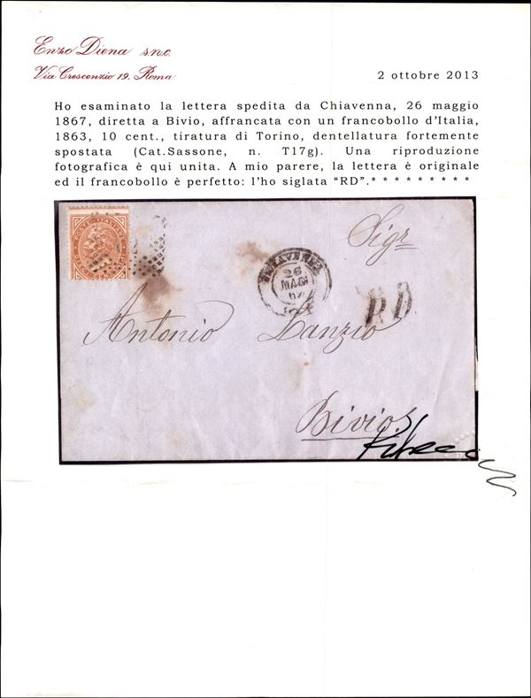 Lettera affrancata con 10 cent (T17g) con dentellatura fortemente spostata da Chiavenna a Bivio del 26.5.67 - cert. Diena