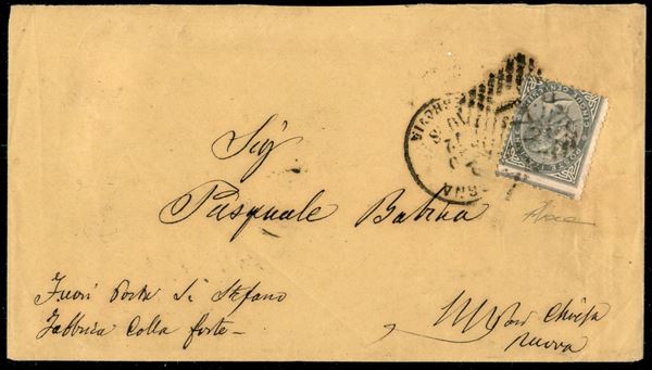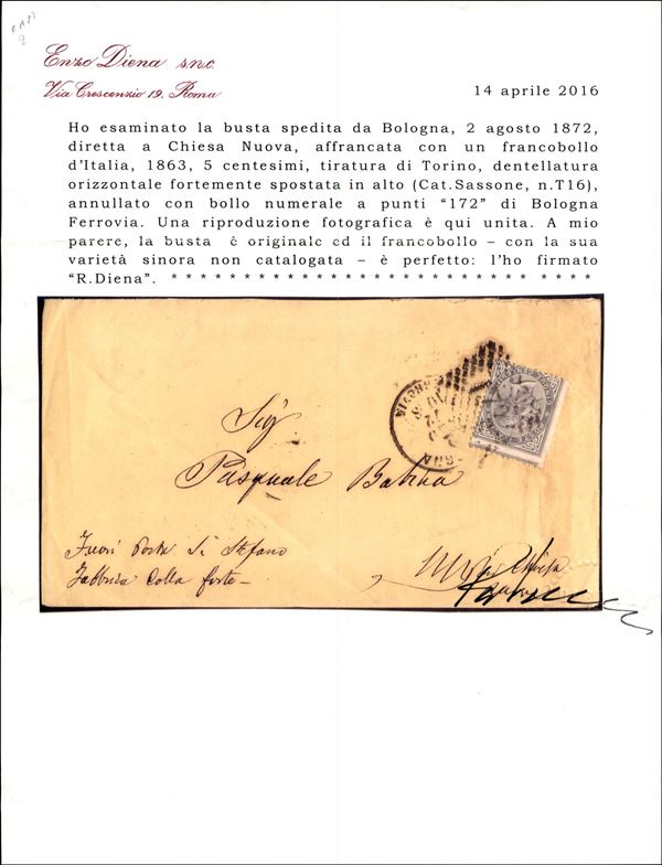 Lettera affrancata con 5 cent (T16g) con dentellatura fortemente spostata da Bologna a Chiesa Nuova del 2.8.72 - cert. Diena