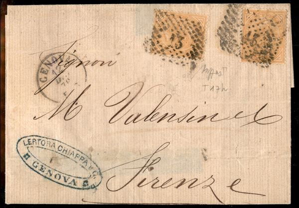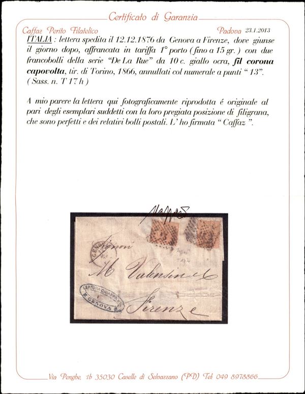 Lettera affrancata con due 10 cent (T17h) con filigrana capovolta da Genova a Firenze del 12.12.76 - cert. Caffaz
