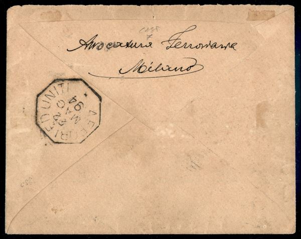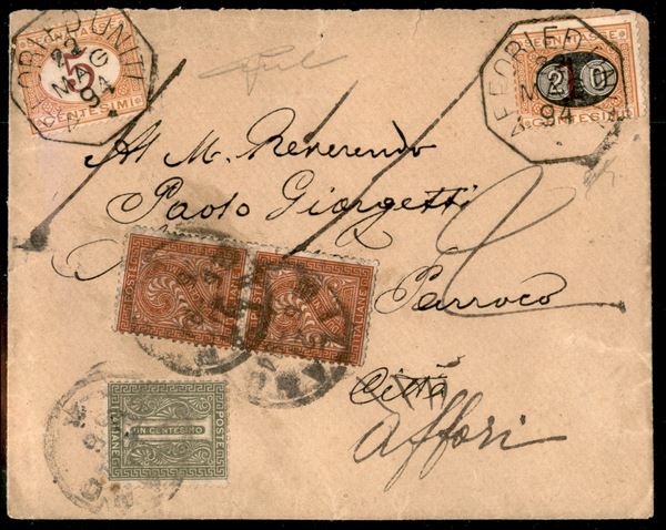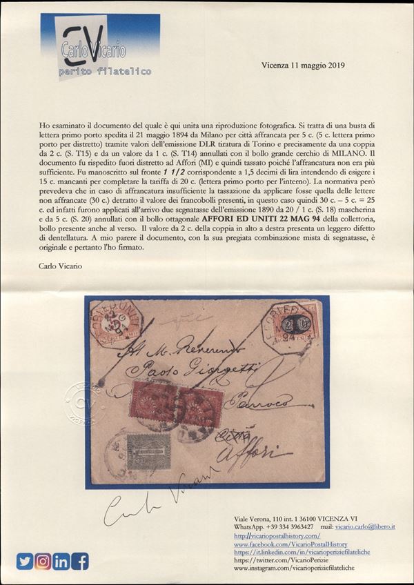 Lettera affrancata per 5 cent (T14 + due T15) per Milano poi rispedita e tassata in arrivo per 25 cent (18 + 20 Segnatasse) ad Affori ed Uniti 22.5.94 (fuori distretto) - cert. Vicario