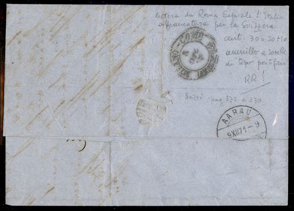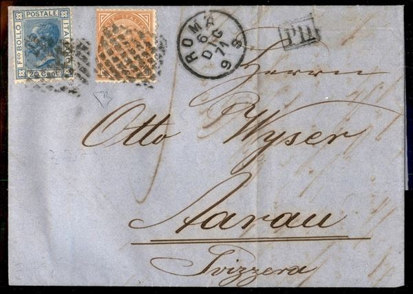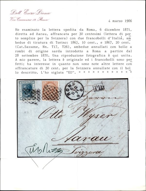 Lettera per la Svizzera (Arau) del 6.12.71 affrancata con un 10 cent tiratura di Torino (T17) + un 20 cent Bigola (26) e annullata con rombi di Sardegna - unica lettera viaggiata con 30 cent per la Svizzera - cert. Diena