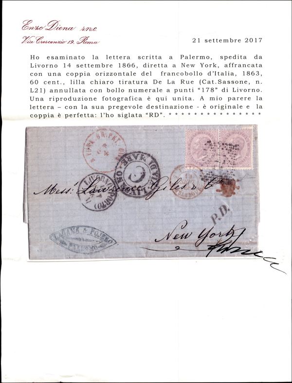 Livorno Via di Mare C - lettera affrancata con coppia del 60 cent (L21) scritta a Palermo e spedita a Livorno per New York del 14.9.66 - cert. Diena