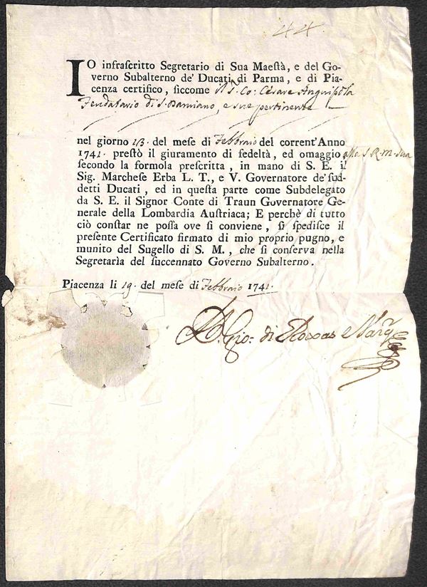 Piacenza 29 febbraio 1742 - certificato del giuramento di fedeltà di Cesare Anguissola (alla S.R.M.) con firma autografa di Don Giovanni di Roxas Nary (Segretario particolare di Carlo V°)